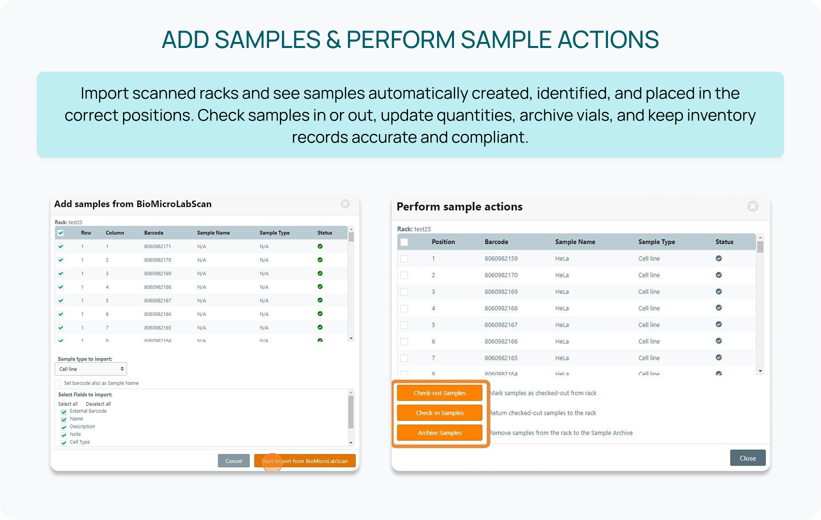 Update sample positions and rack contents instantly by scanning either the rack or individual vials. - Create racks and samples automatically