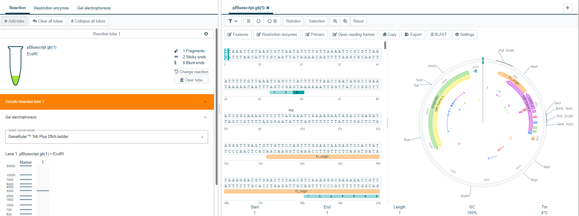 Simulate gel electrophoresis results for one or multiple reactions, supporting verification of restriction digests and experimental planning. - Work with multiple reactions simultaneously