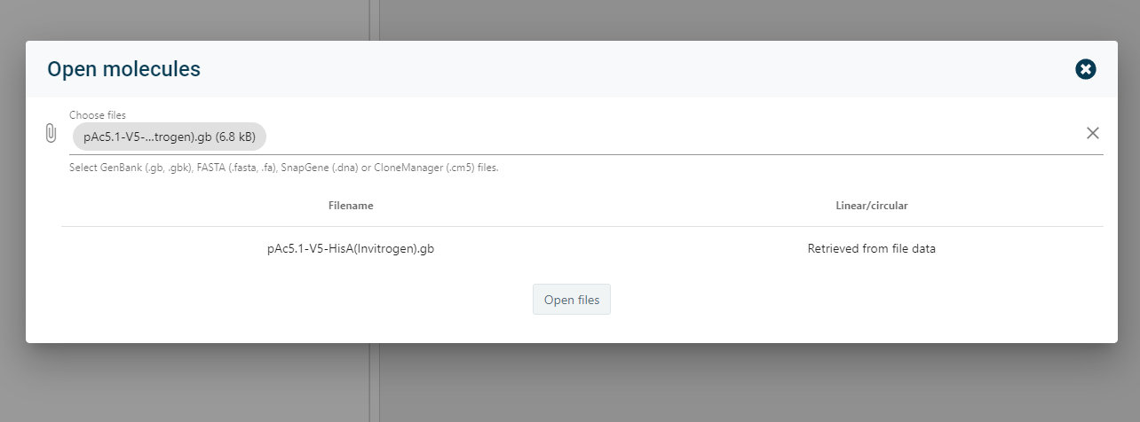 Import sequences from common formats including SnapGene (.dna), GenBank (.gb), CloneManager (.cm5), and FASTA (.fasta). Export molecules as image files (.png) for reporting or sharing. - Customizable visualizations