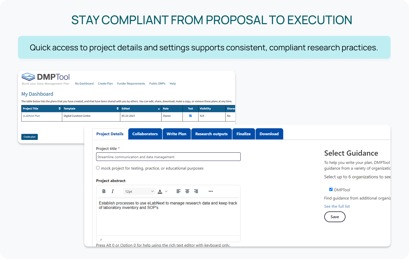 - Simplified collaboration: Make DMPs accessible to lab members for easier review and alignment. Ongoing compliance support