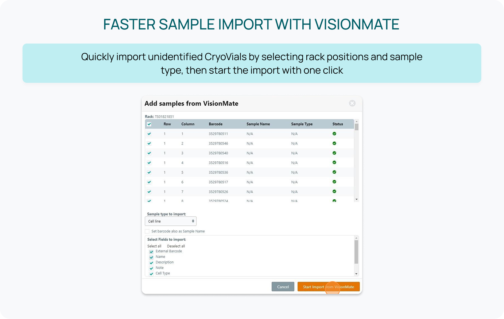With one rack scan, users can sync vial positions, create or update sample records, and perform inventory actions, reducing manual work and minimizing errors.